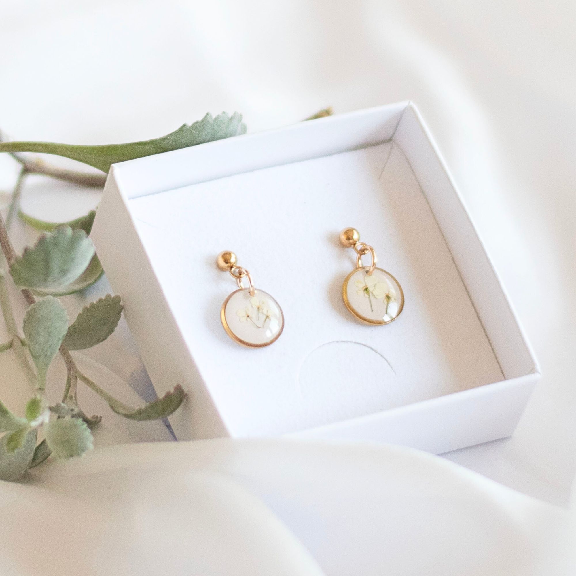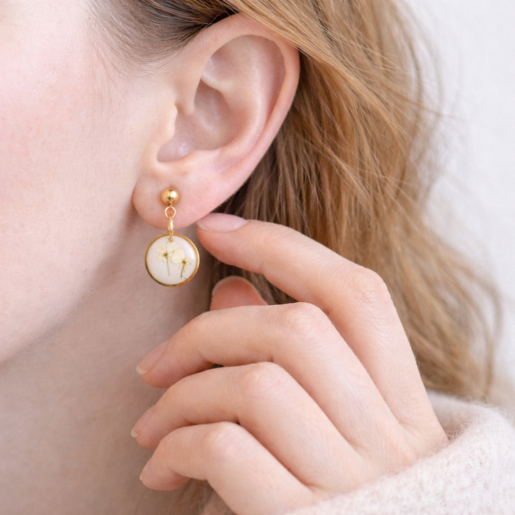 V uhanih so ujeti pravi, ročno nabrani in posušeni cvetovi divjega korenja, ohranjeni v bež epoksidni smoli.