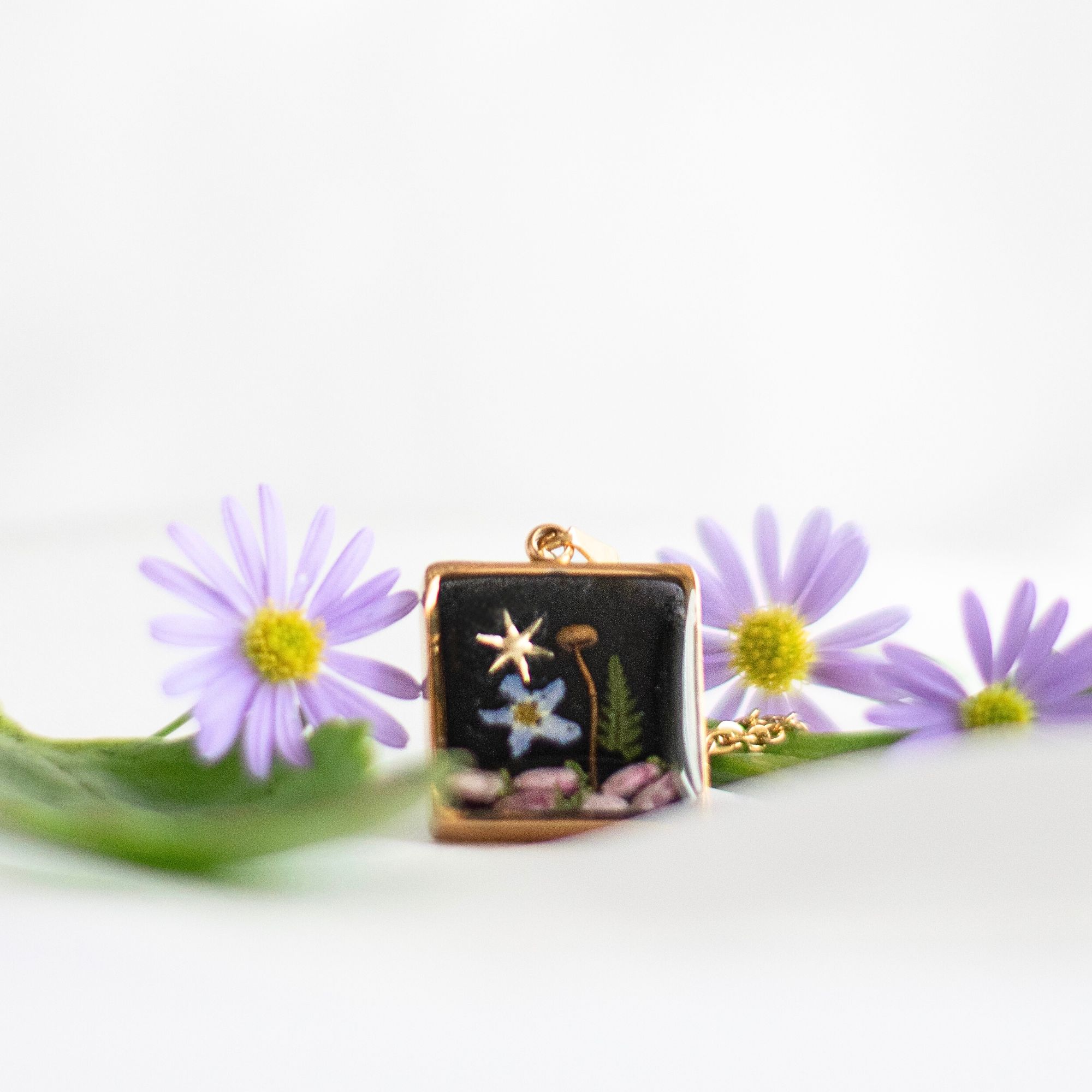 Obesek čarobni gozd je izdelan iz pravih gozdnih rastlin, kot so gobica, praprot, spominčica in vresje ter zaključen z zvezdico, ki mu doda magičnost. Obesek ustvari svet, kjer čas teče počasneje in narava šepeta svoje zgodbe.