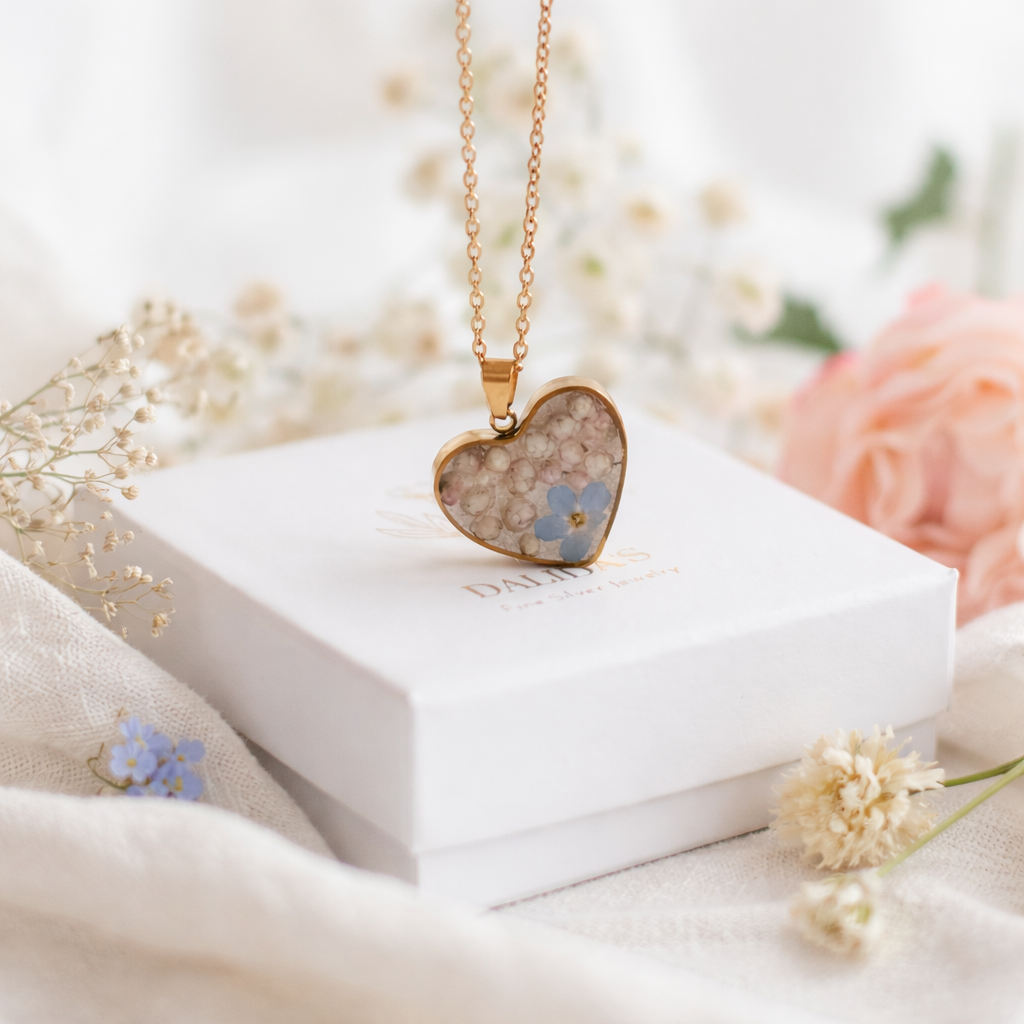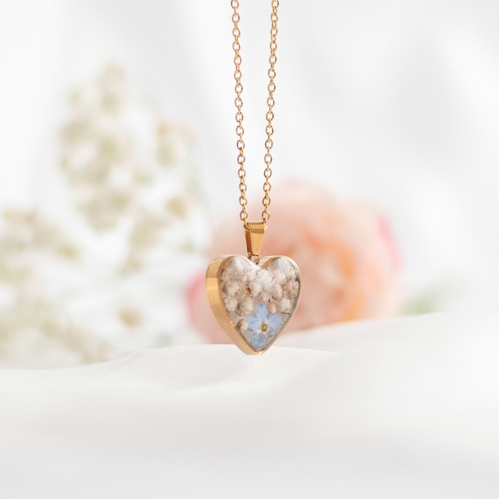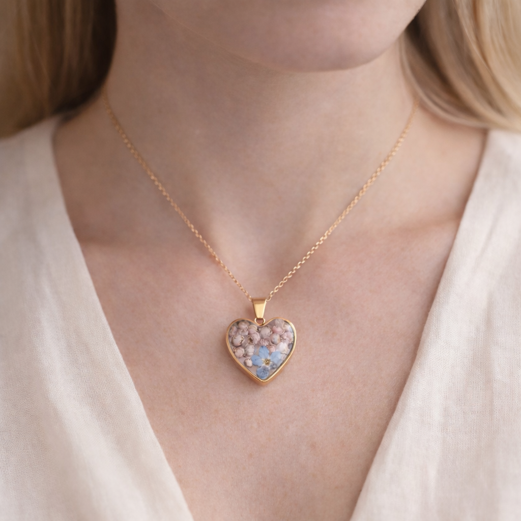 Verižica srce z riževim cvetom in spominčico, pozlačena